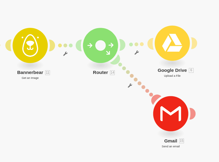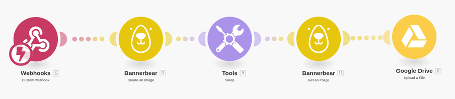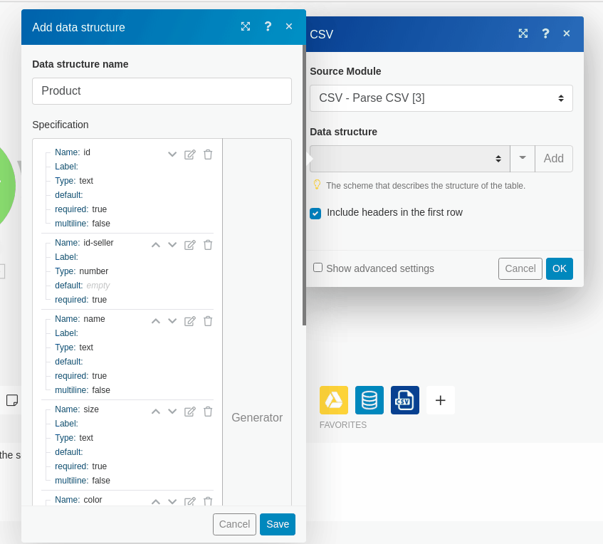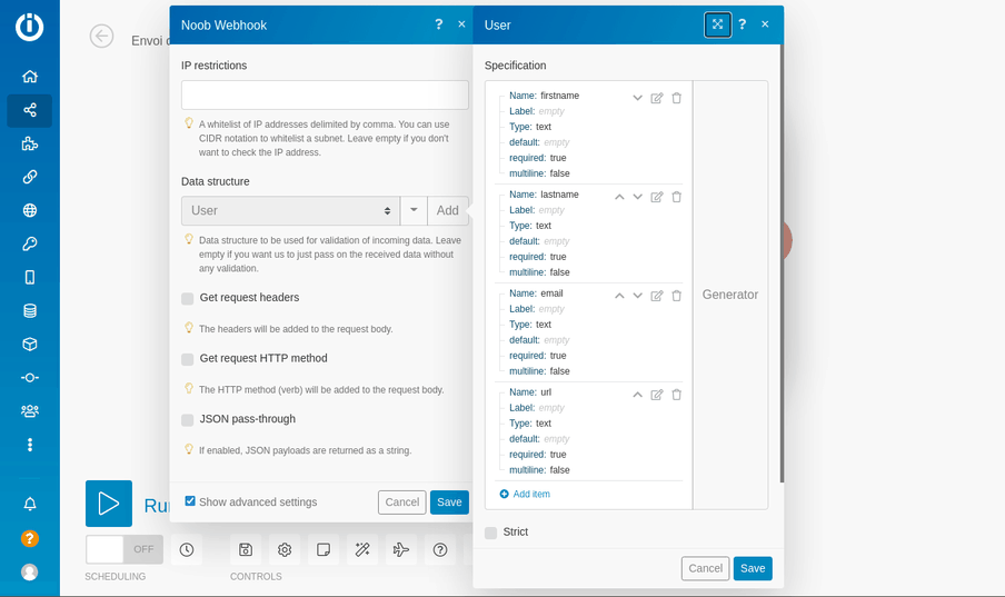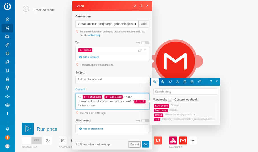 On the scenario building page, each node is represented by a bubble: adding and configuring is done directly on the page. Integromat allows you to create "Data Structures" and to store data ("Data Stores") that you can prepare in advance in their own menus and then use them in the scenarios.