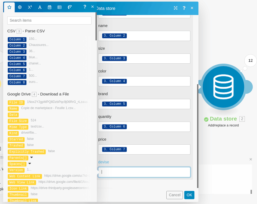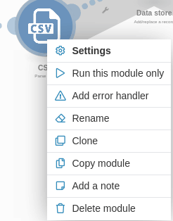 To be sure of uploaded document pattern and to save the data to potentially use in another scenario, I use the Data Store node which will map each CSV entry to a database entry.