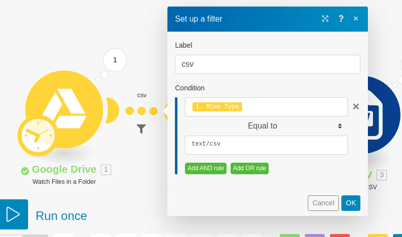 It is possible to add filters between the nodes. To avoid errors during processing, I added the condition to accept only CSV documents for the following steps.