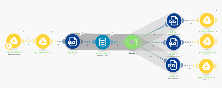 For my need, I have to create 3 different CSV based Data Structures and save them in a folder. The Router node allows to parallelize the work.