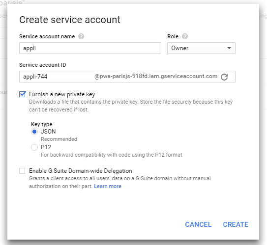 serviceAccount: 'pwa-parisjs-cf0bc079ee69.json' // Name of the json file at the root of your app folder