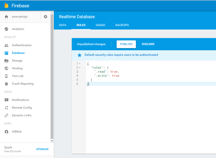 databaseURL: 'https://pwa-parisjs.firebaseio.com/', // To be found in the Database tab