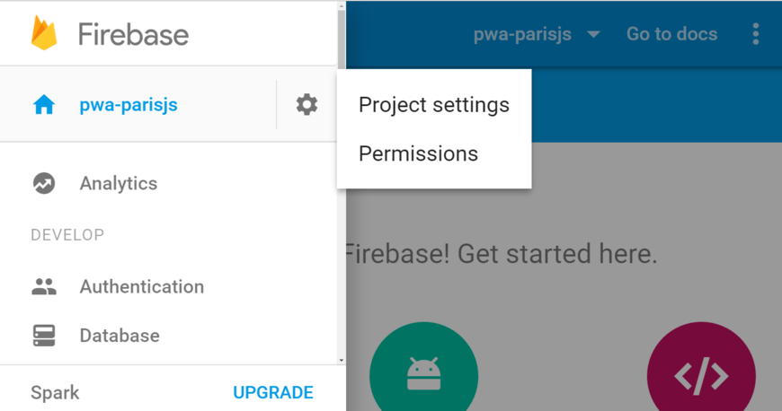 In the app.js file, we initialize Firebase. You are going to need a server key file. Click the wheel in Firebase, and then "Permissions". You are now taken to another console.