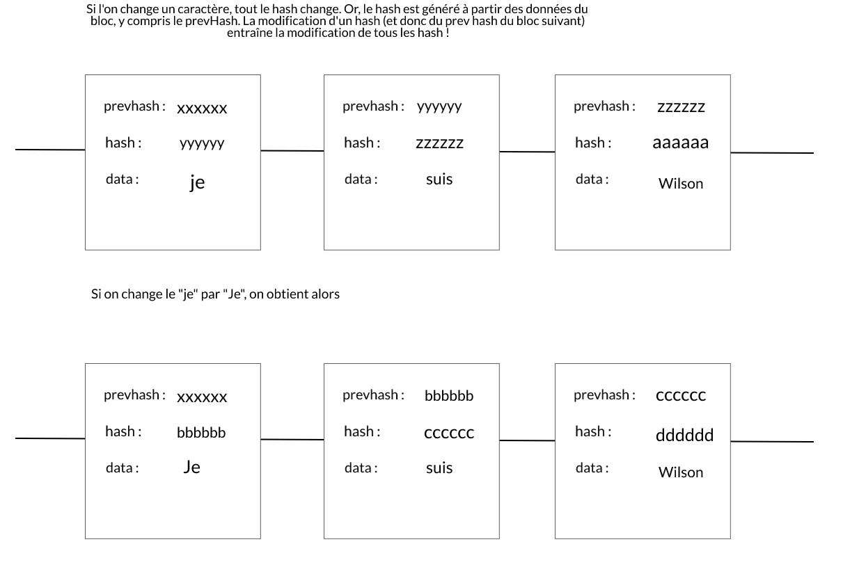 On entend souvent dire que la blockchain est immutable, ou non modifiable. En théorie, c'est faux. Modifier un bloc ne demande pas énormément de connaissances ou de ressources. Cependant, à la moindre modification du contenu d'un bloc, son hash va être modifié, et va donc entraîner la modification de tous les blocs suivants dans la chaîne (puisque dans le hash d'un bloc, on hash également le previous hash du bloc précédent… Si si, c'est logique !).