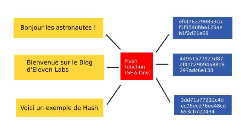 Un hash cryptographique est une chaîne de caractère créée en appliquant une fonction de hachage, qui va transformer cette chaîne de caractère en une chaîne différente. Une première propriété de ces fonctions concerne le nombre de caractère du hash, qui reste fixe quelque soit la taille de la chaîne chiffrée. La deuxième propriété de ce hash est tout aussi intéressante dans le cadre de la blockchain : le moindre changement de virgule dans une string, et le hash change complètement !
