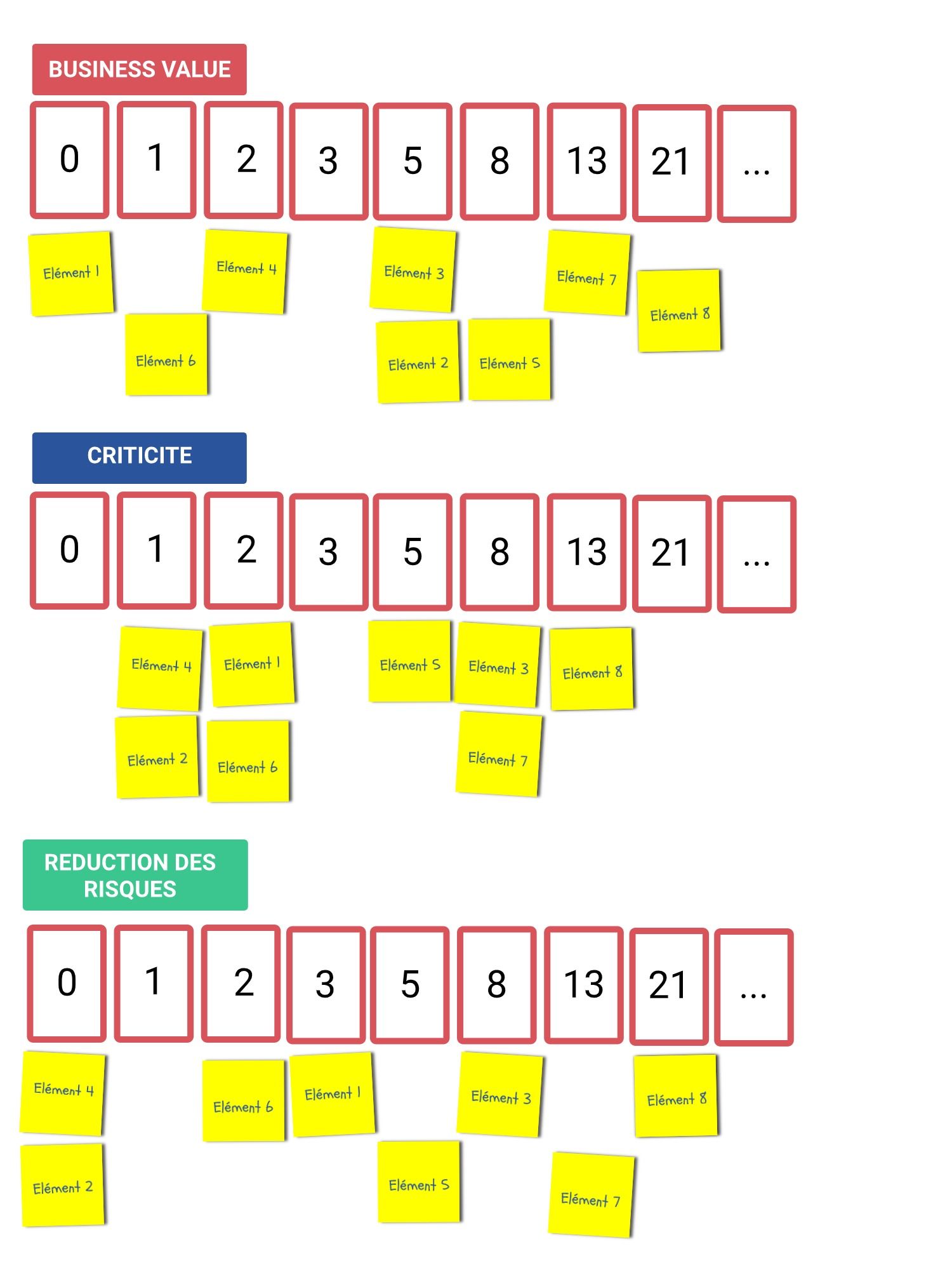 3. 1, 2, 3 - Scorez : comme dans une session de poker planning qu’on peut appeler ici priority poker, un élément du backlog est présenté et les participants choisissent une carte numérotée pour estimer la valeur business