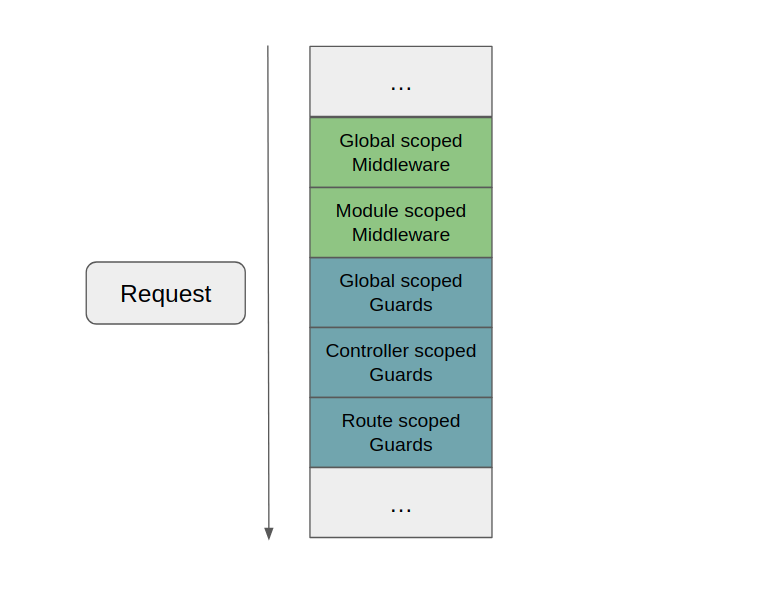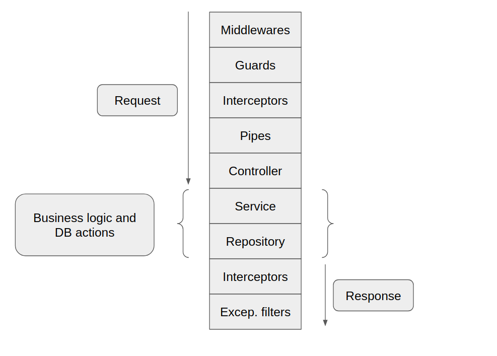 Comme vous pouvez le constater, une requête, avant d'arriver au Controller, peut passer par 4 premières couches qui sont dans l'ordre : Middleware -> Guard -> Interceptor -> Pipe. Puis, libre à votre Controller d'appeler tout Service (où par convention repose votre logique métier) ou Repository (pour les appels à la base de données) pour traiter la requête. Enfin, le Controller renverra une réponse qui, comme vous le constatez, peut à nouveau passer par un Interceptor, puis par les Exception Filters. Nous allons dans cet article expliquer à quoi correspond chacune de ces étapes.