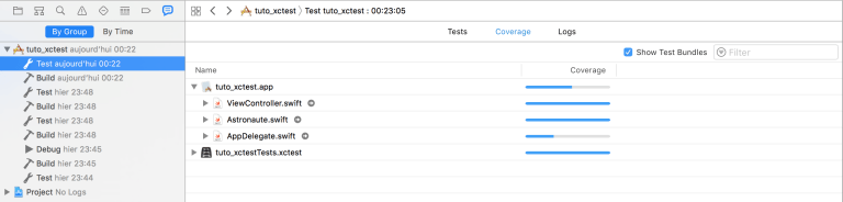 Une fois ces étapes effectuées, relancez le processus de test sur votre classe et cliquez sur l’icône qui ressemble à un message dans votre onglet à gauche puis dans l’onglet principal sélectionnez Code Coverage. N’oubliez pas de cocher dans cette partie la checkbox “Show Test Bundles”